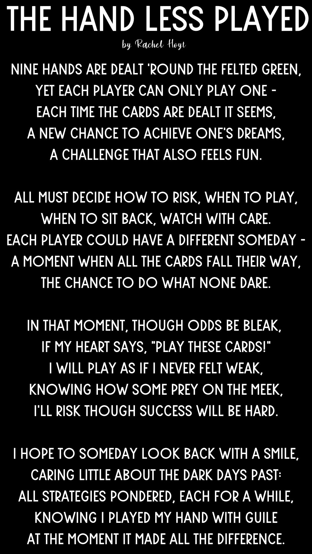 Though it feels like I need a miracle to stay in the game, I believe I must do all I can to have faith that everything will work out as it should. I must scour the job boards far and wide for gainful employment and affordable housing, work hard to sell the products I have created, remember that God’s ways are not our ways, and hope that putting this information about my dreams out in the universe will help me accept whatever comes next. Failure is hard to accept but uncertainty is infinitely more difficult. The poker table is where I began to see that we have no choice but to accept it. No matter how much you know about any poker hand or moment in life, there are always unseen forces in play, whether or not you use God and Satan to explain the good or bad “luck” they bring. The only thing I really know is that I want to be an example of good and am playing my cards the best I can.
