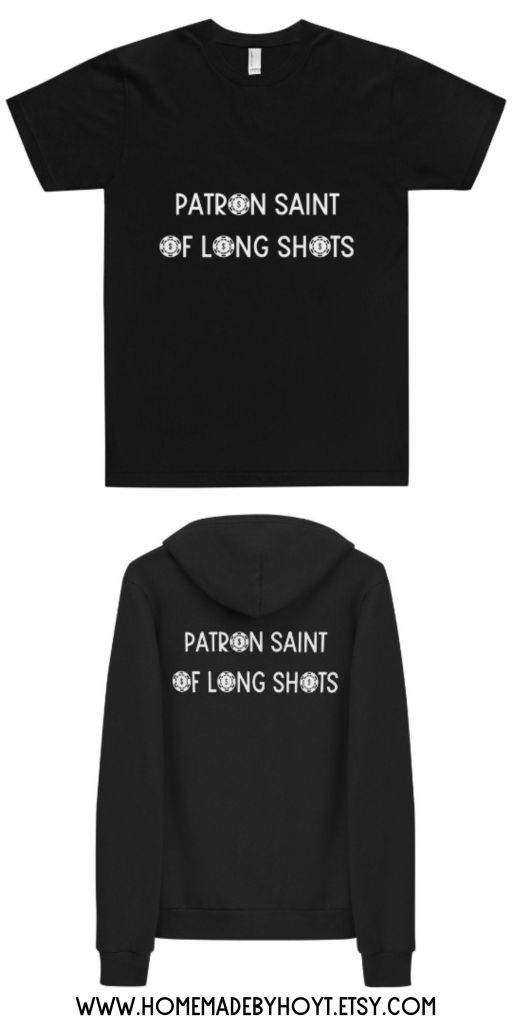 If you wish to be my Patron Saint of Long Shots but can barely afford a shirt… why not buy this design or something else from my shop to show your support?