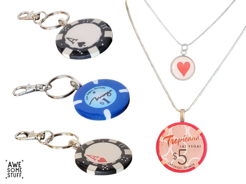 Many of the pendant necklaces that I create are made with vintage poker chips from home sets… but I recently began adding items made with Las Vegas casino poker chips too! Right now you can get a Mirage Casino poker chip keychain, a Tropicana Casino poker chip keychain, or a Horseshoe Casino poker chip necklace… and I will add more handmade necklaces, handmade keychains, and handmade bag charms as soon as I can.