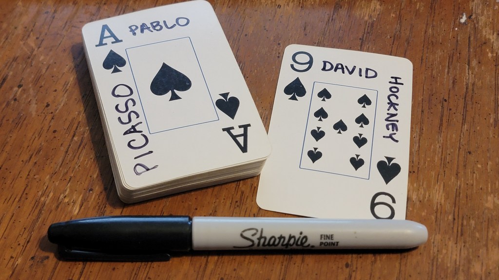 I’m still not sure I’m quite ready to commit my ideas to canvas… so, I will start by trying new techniques in my sketchbook. To prevent myself from sitting around thinking about what style to try each day, I decided to put an artist name on each playing card in the deck so that I could shuffle and deal a choice instead.